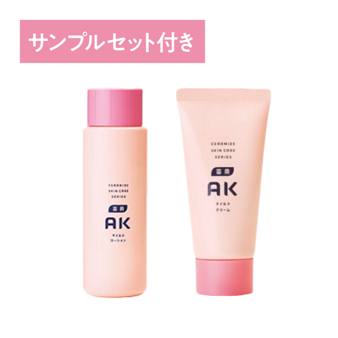 | 特徴 | ・薬用AKマイルドクリーム 天然セラミド※の効果で肌のかさつきや乾燥から肌をしっかり守るクリームです。W/O型エマルジョン化で、しっとりするのにべたつきません。顔・全身のケアにお使いいただけます。 ※保湿成分として ・薬用AKマイルドローション 微粒子化(ナノ化)した天然セラミド※がバリア機能を整え、かさつきがちな肌をしっとりうるおす化粧水です。顔はもちろん全身のケアに使えます。 ※保湿成分として |
