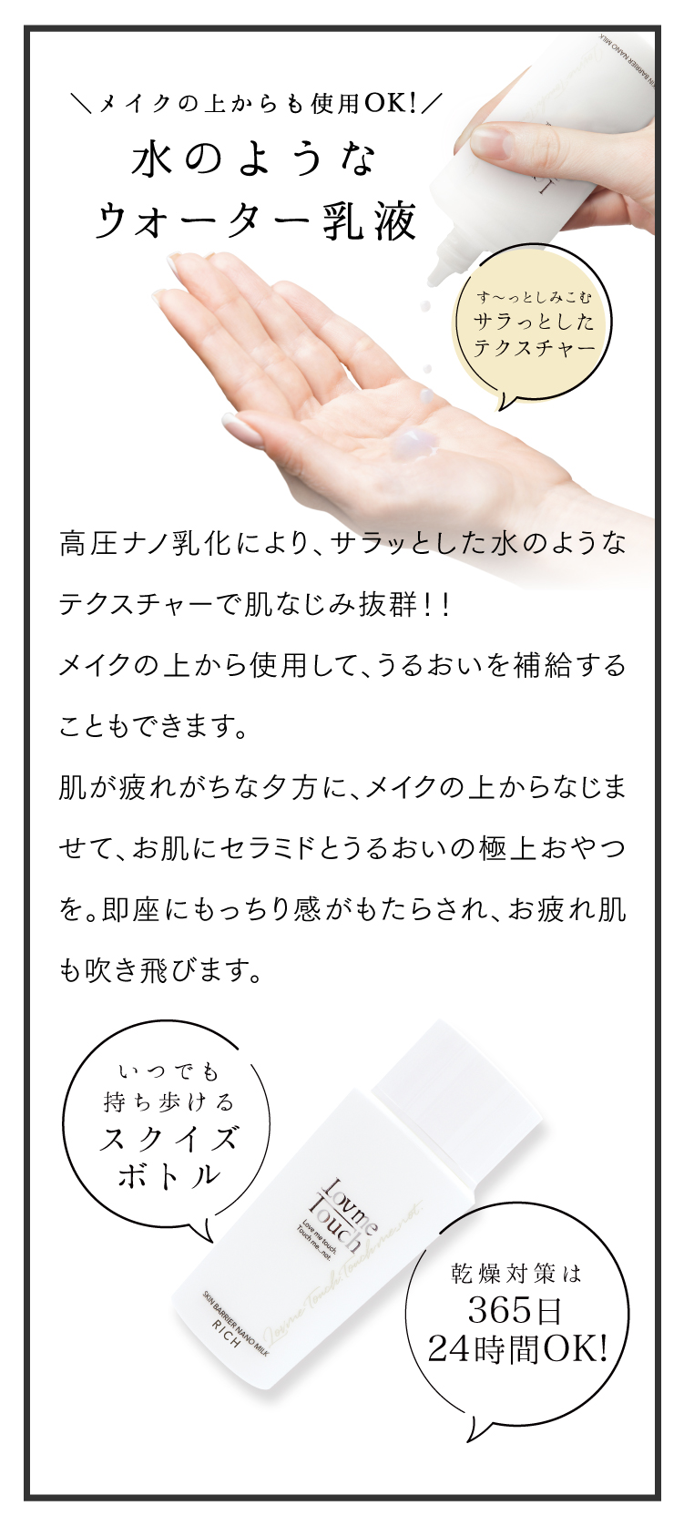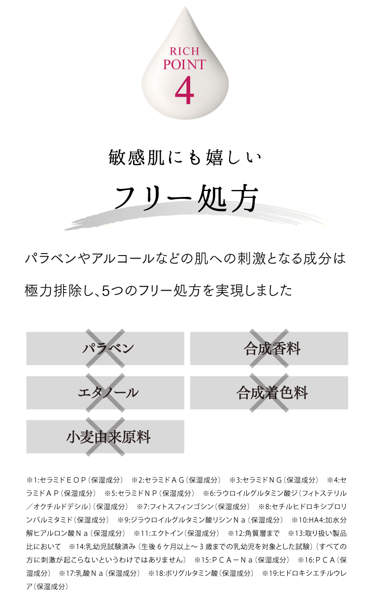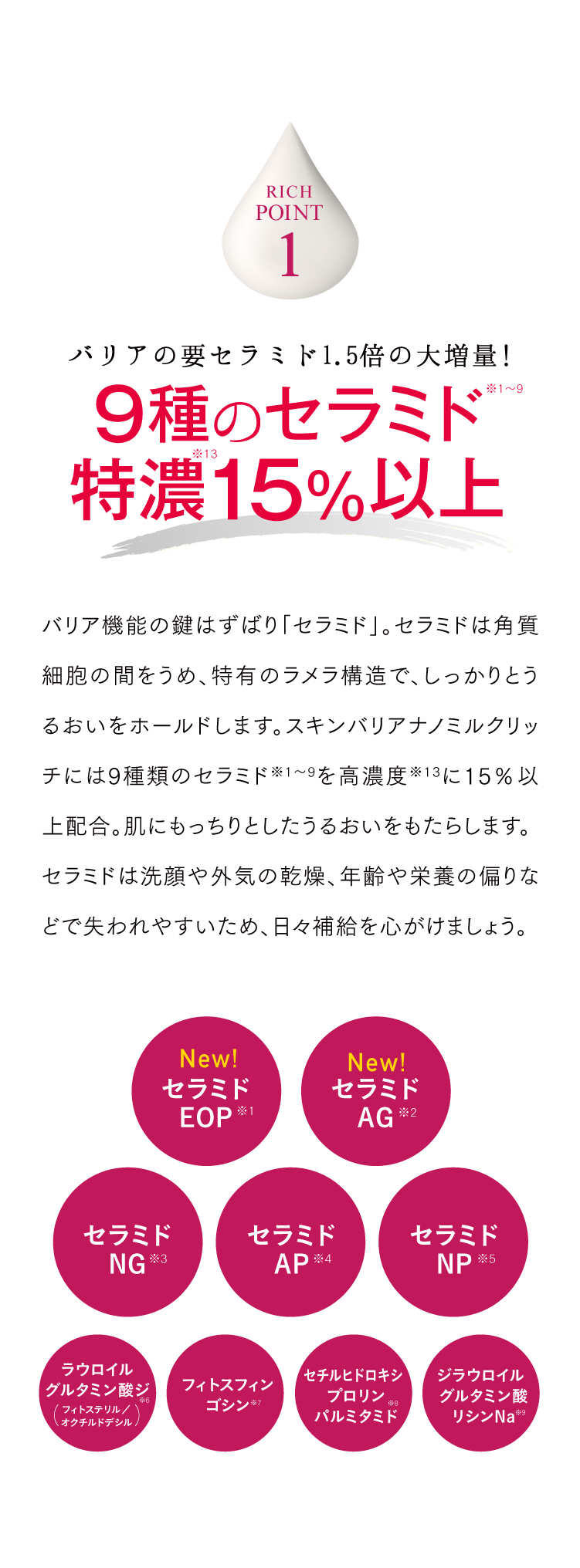 | 特徴 | 保湿効果にすぐれた「セラミド(※1)」を従来品の1.5倍、15%以上配合した特濃(※2)処方。さらに話題の「HA4(※3)」や貯水成分「エクトイン(※4)」を贅沢配合することで極上のうるおいを抱え込み、肌バリアをサポートします。高圧ナノ乳化技術により高浸透(※5)を実現し、24時間乾燥知らずのうるおい肌へ導きます。ウォーター状でべたつかず、メイクの上からもご使用いただけます。 ※1 セラミドEOP、セラミドAG、セラミドNG、セラミドAP、セラミドNP、ラウロイルグルタミン酸ジ(フィトステリル/オクチドデシル)、フィトスフィンゴシン、セチルヒドロキシプロリンパルミタミド、ジラウロイルグルタミン酸リシンNa(整肌成分) ※2 取り扱い製品比において ※3 加水分解ヒアルロン酸(保湿成分) ※4 エクトイン(保湿成分) ※5 角質層まで |