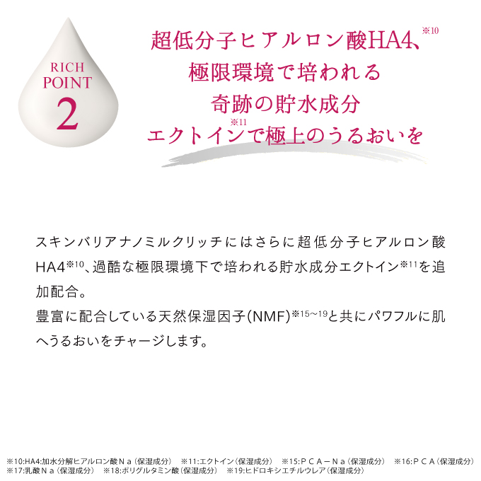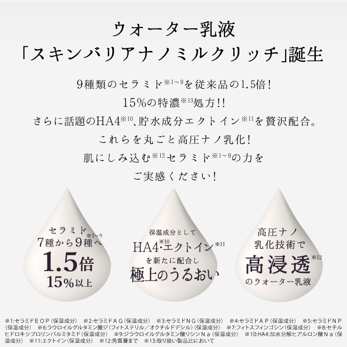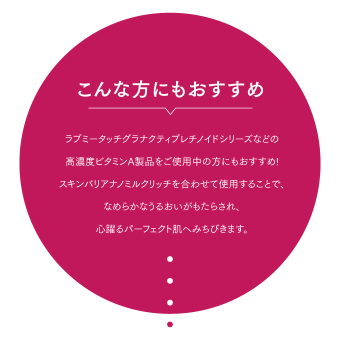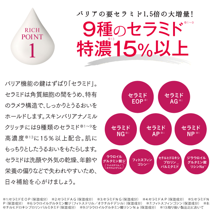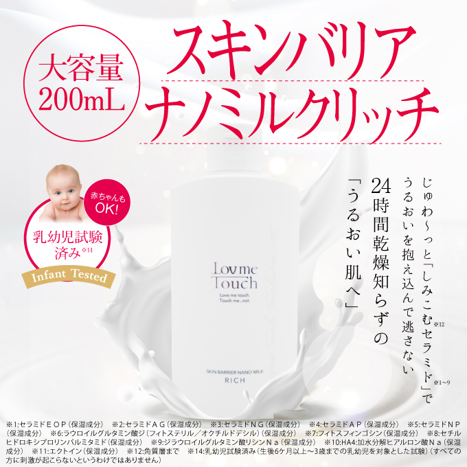 | 特徴 | lov me Touchシリーズにて不動の人気を誇るスキンバリアナノミルク リッチ。みなさまの声にお答えして大容量バージョンが登場! 保湿効果にすぐれた「セラミド(※1)」を従来品の1.5倍、15%以上配合した特濃(※2)処方。さらに話題の「HA4(※3)」や貯水成分「エクトイン(※4)」を贅沢配合することで極上のうるおいを抱え込み、肌バリアをサポートします。高圧ナノ乳化技術により高浸透(※5)を実現し、24時間乾燥知らずのうるおい肌へ導きます。ウォーター状でべたつかず、メイクの上からもご使用いただけます。 ※1 セラミドEOP、セラミドAG、セラミドNG,セラミドAP,セラミドNP、ラウロイルグルタミン酸ジ(フィトステリル/オクチドデシル)、フィトスフィンゴシン、セチルヒドロキシプロリンパルミタミド、ジラウロイルグルタミン酸リシンNa(整肌成分) ※2 取り扱い製品比において ※3 加水分解ヒアルロン酸(保湿成分) ※4 エクトイン(保湿成分) ※5 角質層まで |