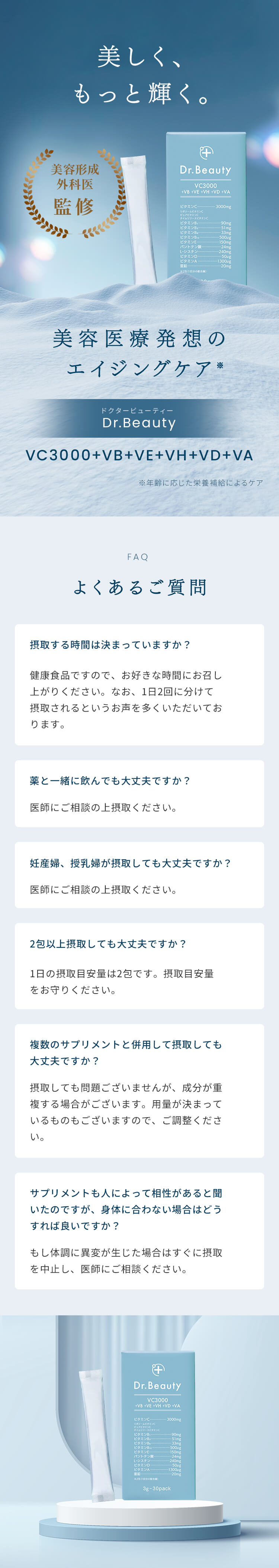 | 特徴 | 01:医療発想のビタミン処方設計 02:独自の高吸収×持続型ビタミンC 03:ビタミン・栄養素の吸収アップ 04:こだわりの剤形 従来のビタミンCサプリメントの課題を解決し、理想の効果を実現する革新的な製品です。 リポソーム化ビタミンC、タイムリリースビタミンCなどを独自の処方設計で配合することで、高い吸収率と吸収持続性を両立しました。 さらに、美容と健康に必要な美容医療機関でも処方されるビタミン・栄養素を配合したマルチビタミンサプリメントです。 |