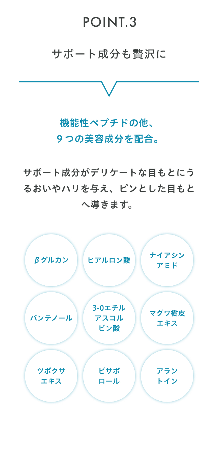 あきらめていたデリケートな目もとに救いの一手。ボツリヌストキシン由来成分や機能性ペプチドをはじめとする画期的な成分を配合した目もと用クリーム。浸透技術MTDにより肌の隅々(角質層)まで素早く浸透し、ターゲットポイントに届けます。 デリケートな目もとだからこそ原料選定から配合量まで徹底的にこだわりつくられた贅沢なクリームが、みずみずしく湧き上がるような真のハリをもたらします。 |
