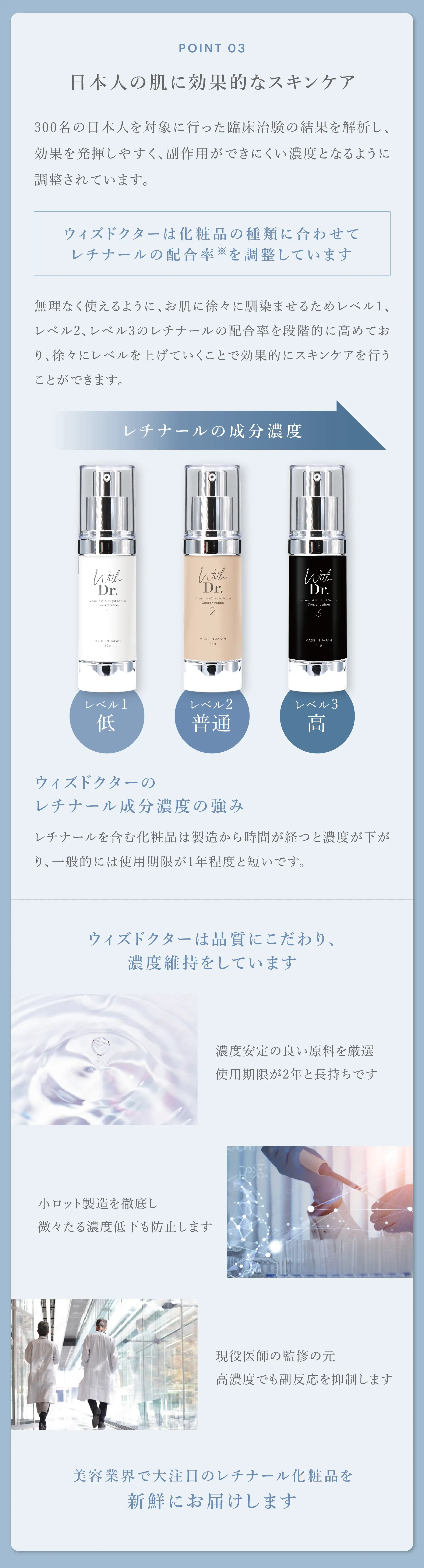 | 特徴 | 日本人のためのビタミンAコスメ。やさしく働くレベル1から肌に確かな実感をもたらすレベル3までの3段階設定。お肌に合わせてお選びいただけます。 レベル1はビタミンAコスメ初心者の方でも毎日使えるやさしいビタミンAクリーム。レベル2は反応を抑えながらも着実な実感が得られる絶妙なビタミンA濃度に設計したビタミンAクリーム。レベル3は医療機関のみで購入可能な高濃度処方。肌にアグレッシブな実感をもたらします。 肌へアクティブにはたらくレチナール、透明感をもたらすリノール酸レチノール、守りのビタミンAパルミチン酸レチノール、肌にうるおいをもたらすレチノイン酸トコフェリルを配合。それぞれ異なる働きを持つ4種類のビタミンAが相乗的に働きます。さらに肌になじみやすく長く働く油溶性ビタミンC「VCIP」や肌を明るく導く「VCエチル」といったビタミンC誘導体を配合し、肌のくすみにアプローチいたします。また、ビタミンAによるネガティブな反応を極力抑えるために、複数の抗炎症成分をはじめ、肌のバリア機能を高めるセラミドやパンテノールといったリペア成分を配合しています。ビタミンAのもつパワフルなアプローチと肌を守るやさしさを兼ね備えたビタミンAクリームです。 |